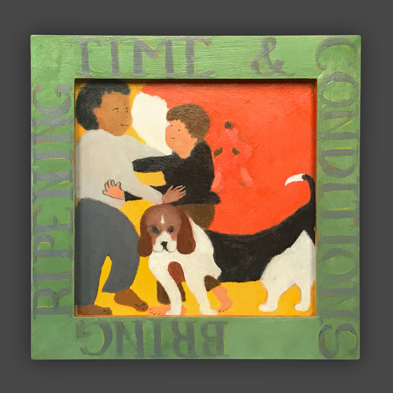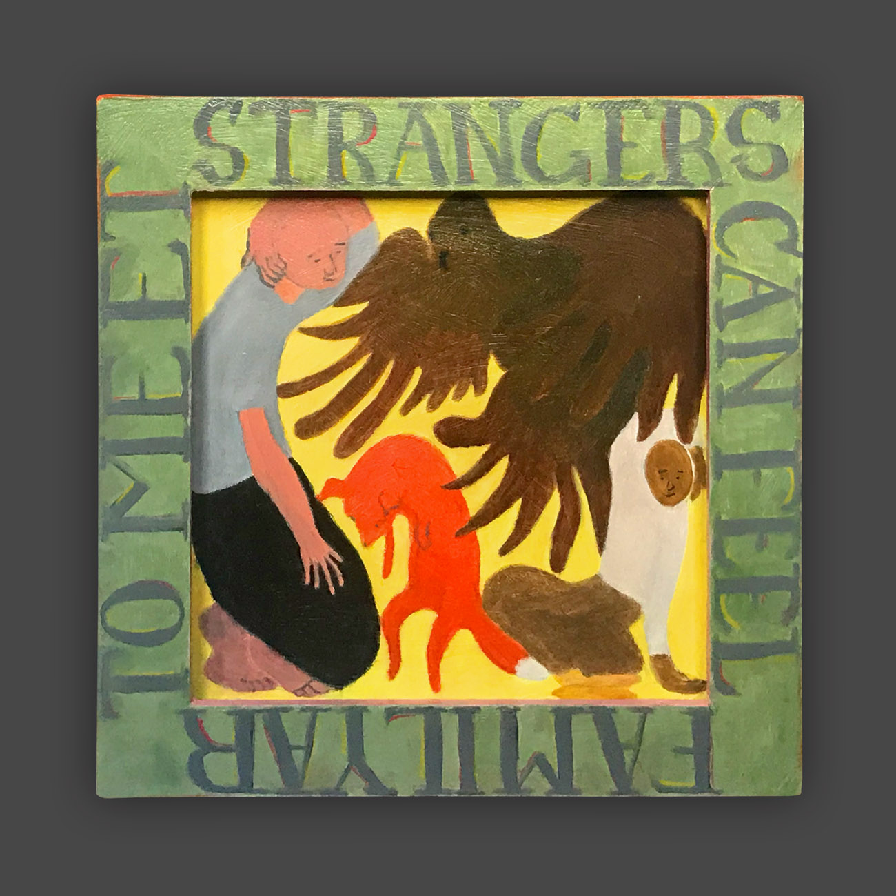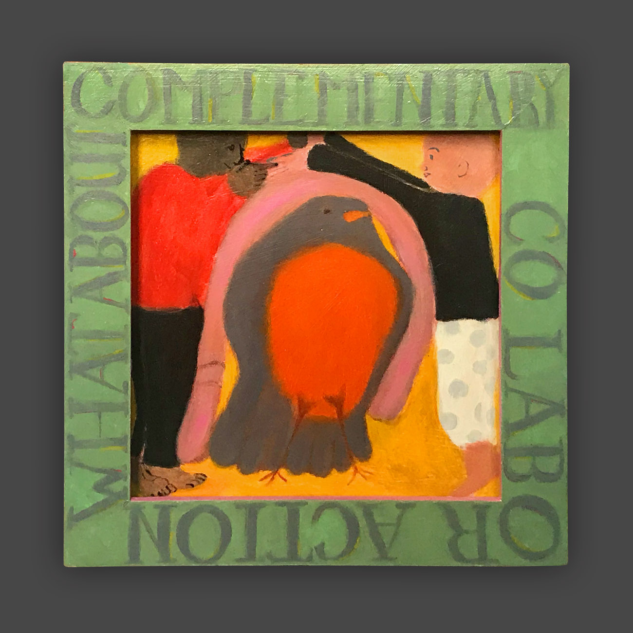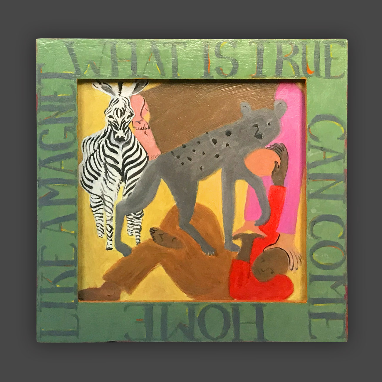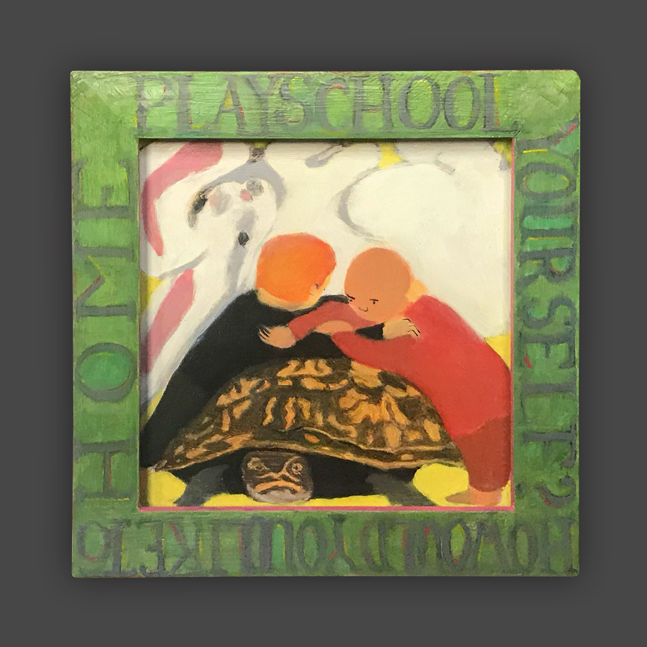 There is a hierarchy of the senses, and of sensory input. Therefore, the words on the frames of these paintings are rendered less vivid, so that they will not visually dominate the image. The narrative of the image is conflated and confusing, so as not to intellectually dominate attention from the puzzle patterns of the colors. In this way, disappointment and enchantment, danger and comfort, friend and foe are harmonizing in a delicate balance, inhabiting the same space. The cheerful colors belie tales of tentative connections, and struggles.