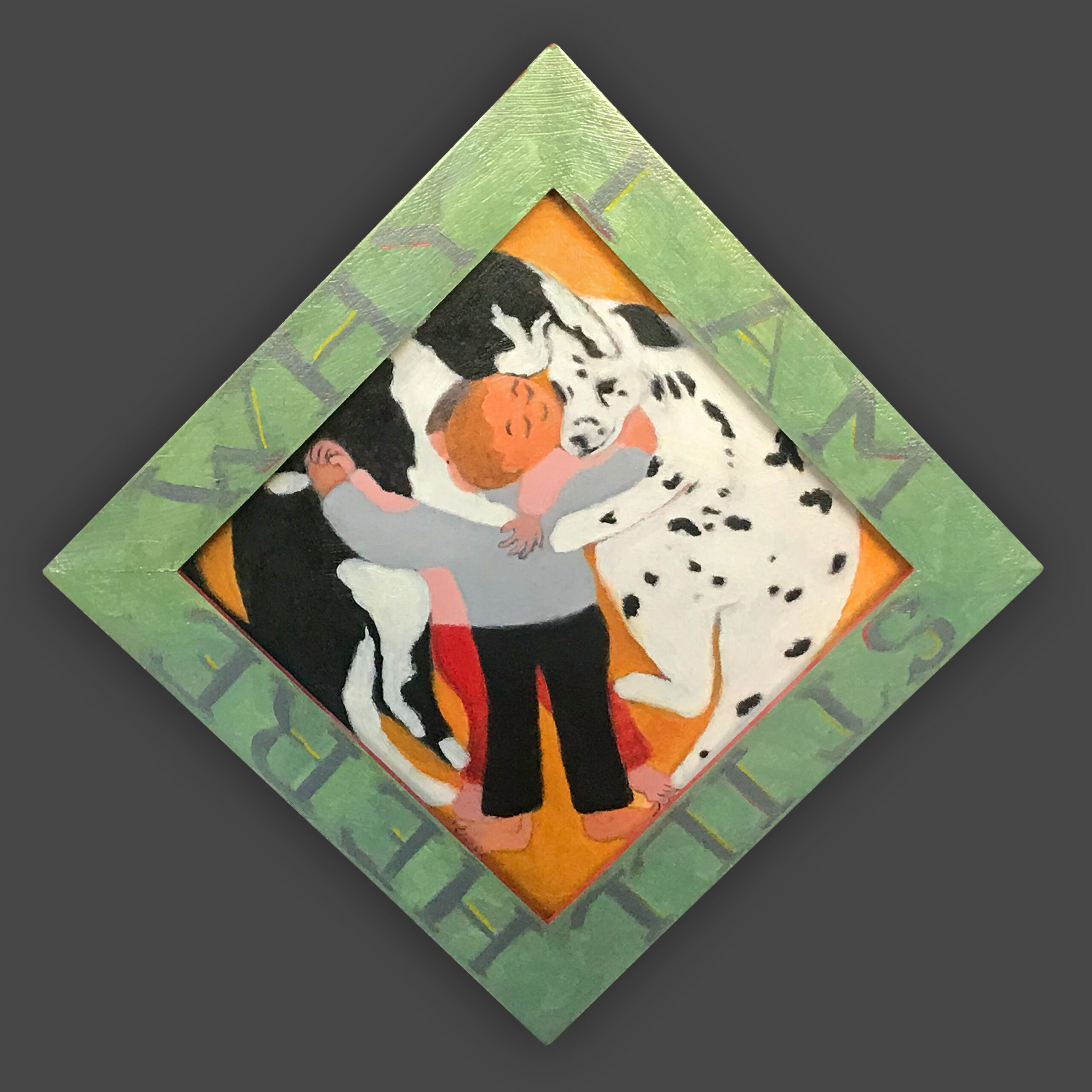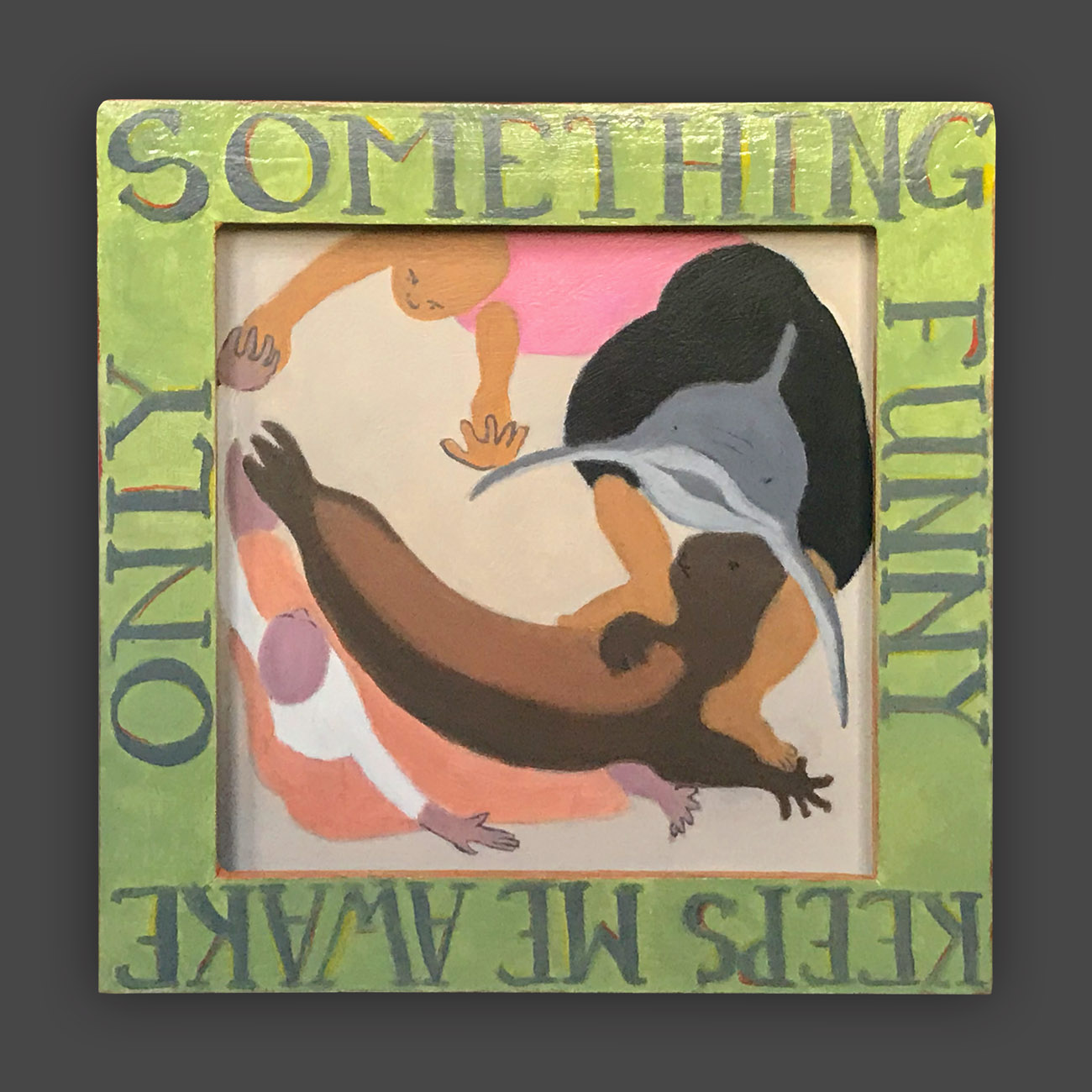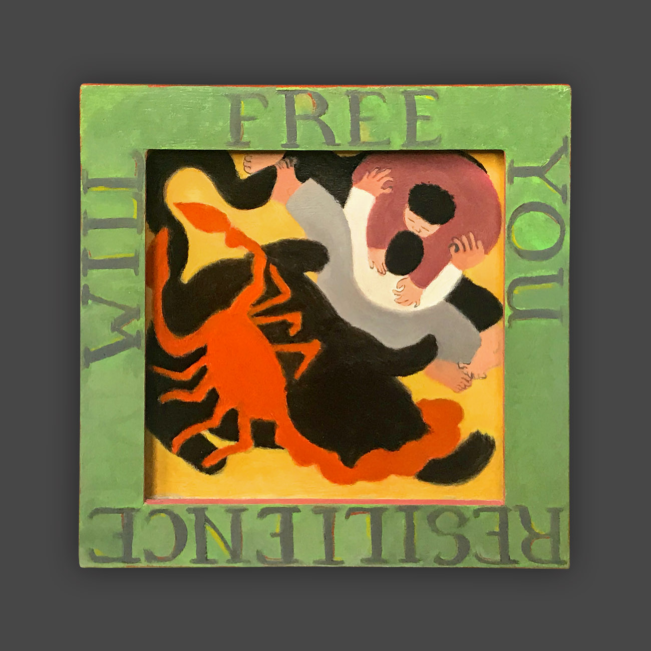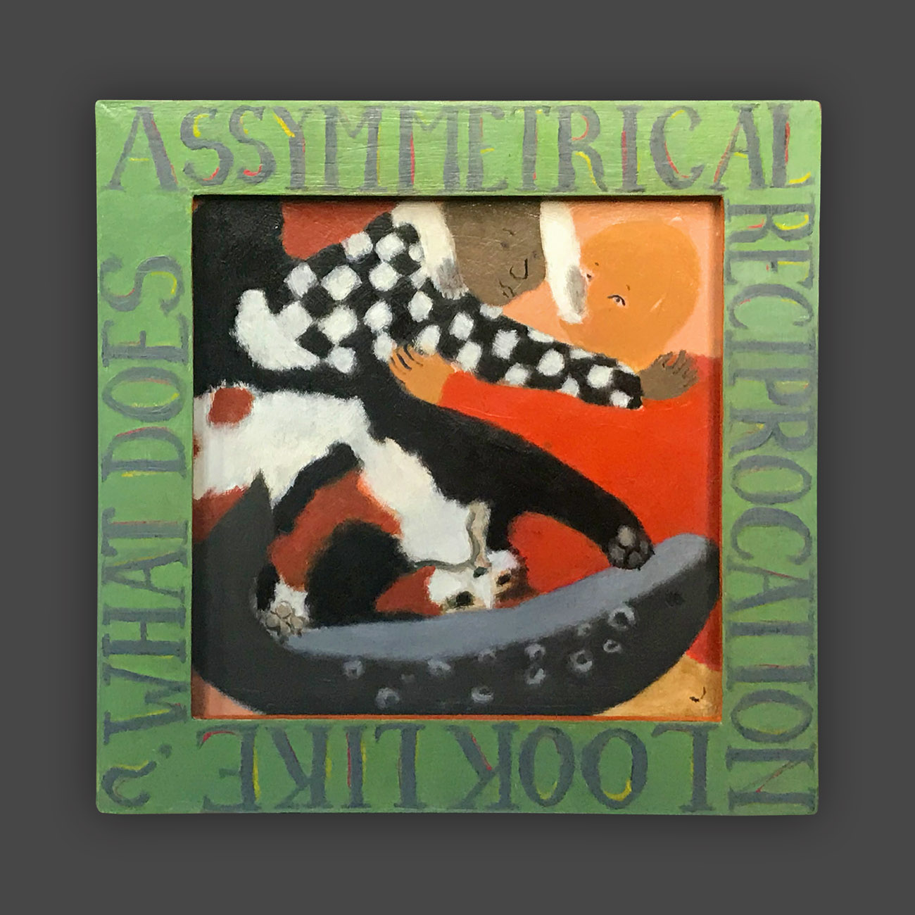 There is a hierarchy of the senses, and of sensory input. Therefore, the words on the frames of these paintings are rendered less vivid, so that they will not visually dominate the image. The narrative of the image is conflated and confusing, so as not to intellectually dominate attention from the puzzle patterns of the colors. In this way, disappointment and enchantment, danger and comfort, friend and foe are harmonizing in a delicate balance, inhabiting the same space. The cheerful colors belie tales of tentative connections, and struggles.