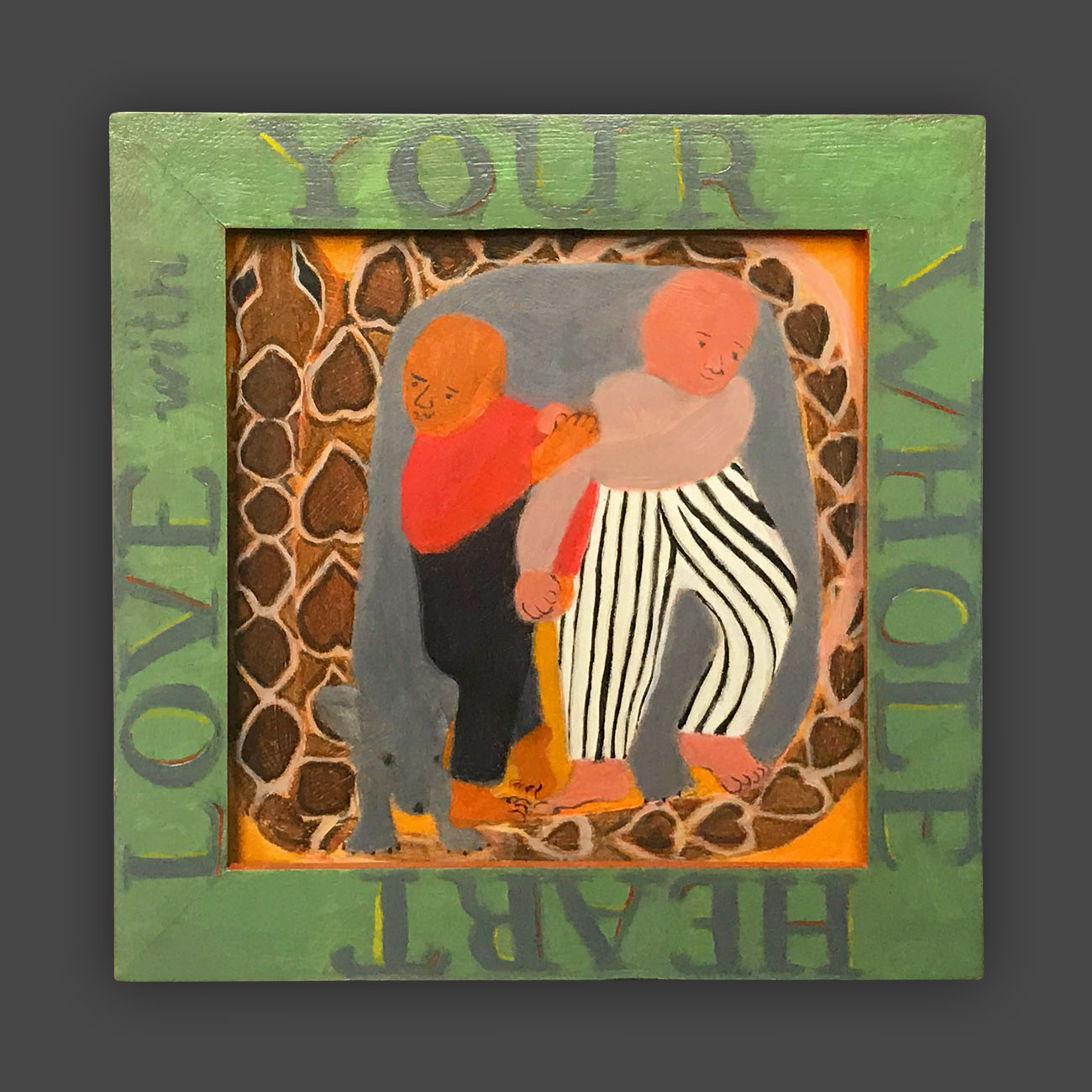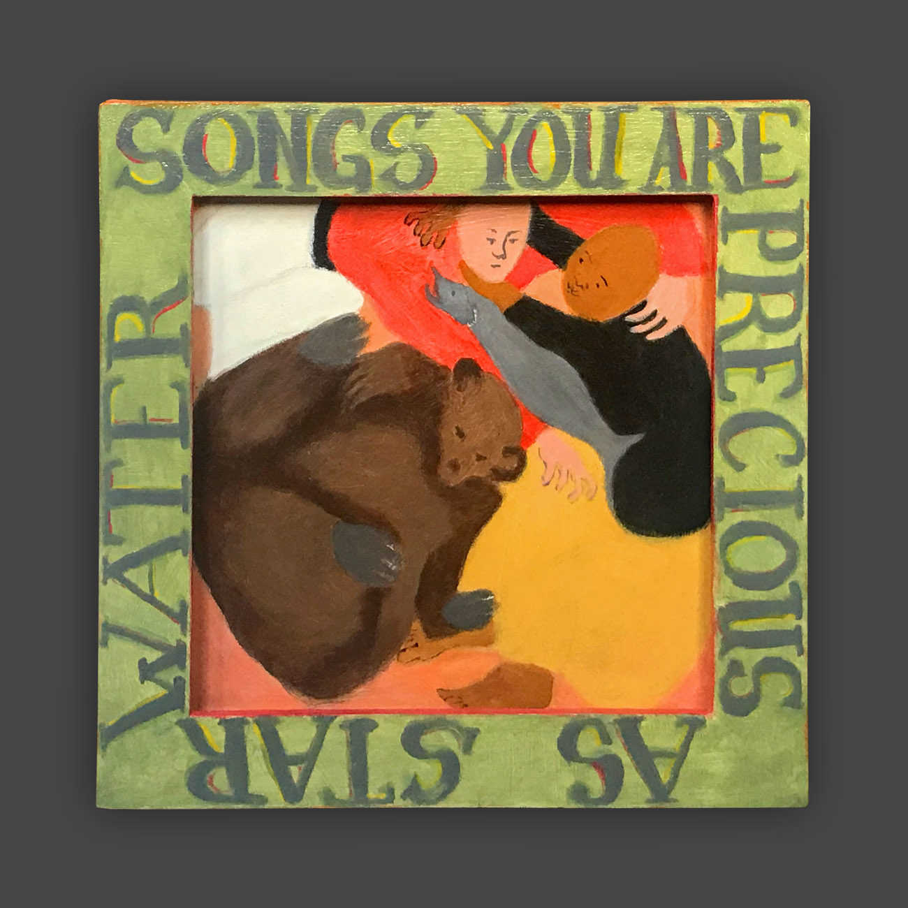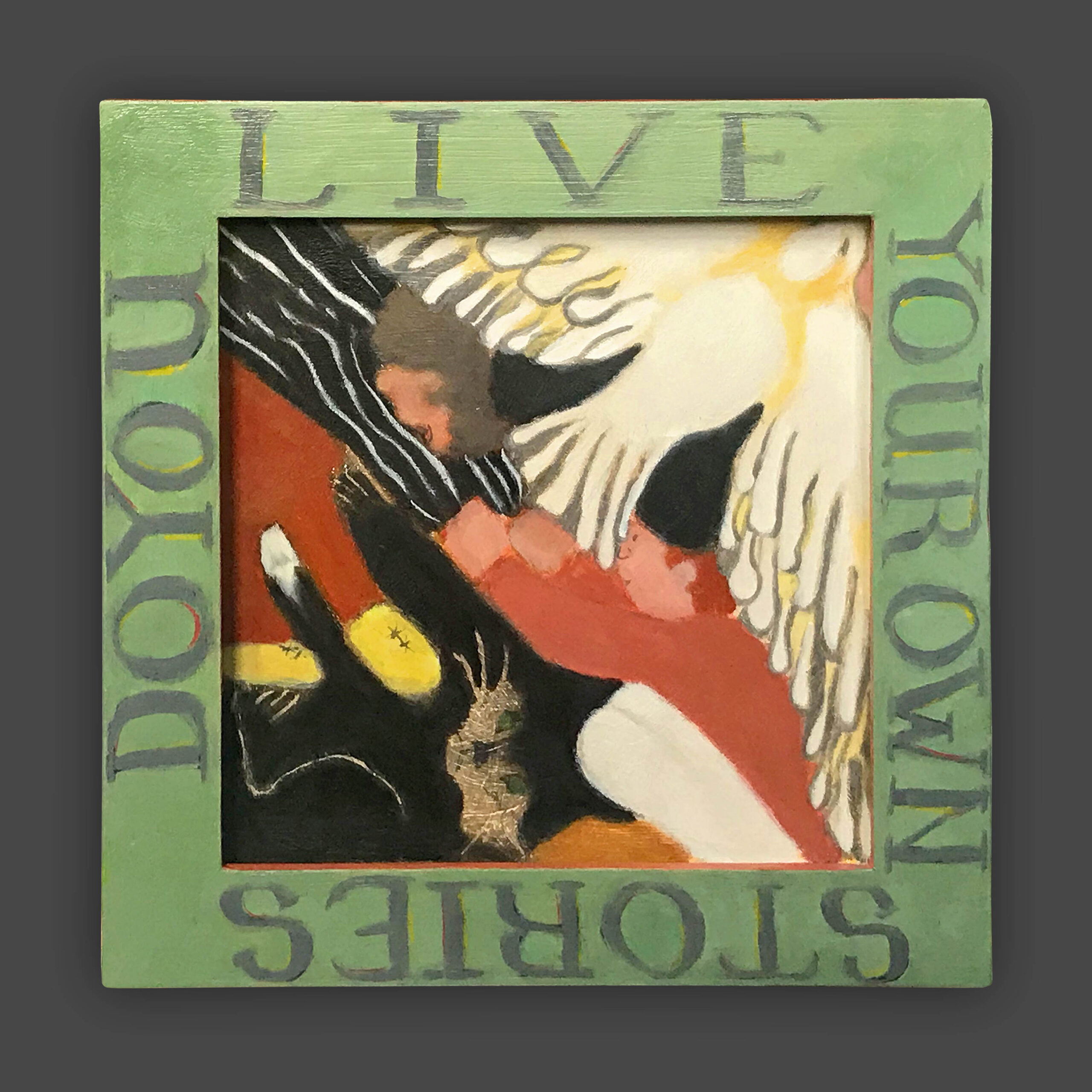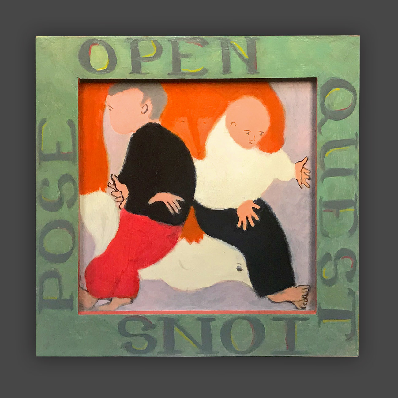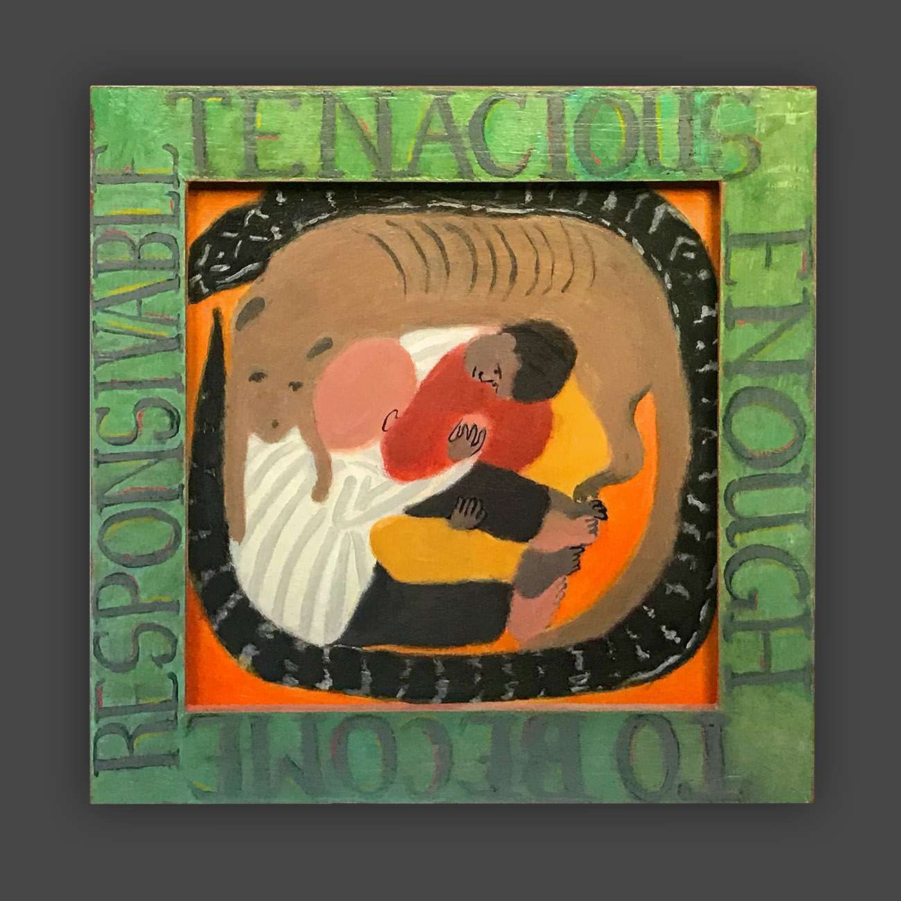 There is a hierarchy of the senses, and of sensory input. Therefore, the words on the frames of these paintings are rendered less vivid, so that they will not visually dominate the image. The narrative of the image is conflated and confusing, so as not to intellectually dominate attention from the puzzle patterns of the colors. In this way, disappointment and enchantment, danger and comfort, friend and foe are harmonizing in a delicate balance, inhabiting the same space. The cheerful colors belie tales of tentative connections, and struggles.