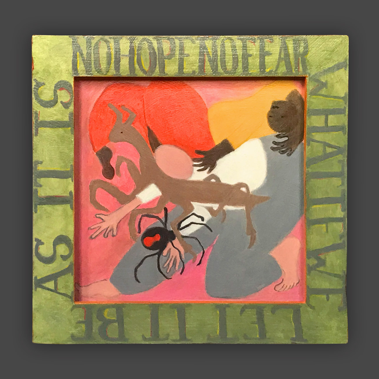 The box forms of the substrate for the paintings emerge off the plane of the wall and impose themselves into our air. They beckon to be picked up and handled. The phrases evolved as necessarily as did the images. Some words had to be made up, spelling altered. Declarations became enigmatic propositions that challenge, comfort and tickle us. These paintings have lived and traveled a lot, acquiring a wabi sabi patina from experience. The wording evolved as necessarily as did the images.