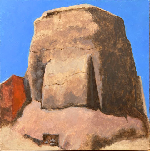 Rushing to get somewhere, I was stopped in my tracks coming upon the back of San Miguel Chapel, the Oldest Church. I knew instantly I had to come back and paint it for this show. No matter how often it is painted, it cannot be reduced to cliche. It belongs with backs and rocks. So on the hottest days, I went there, and made this sketch, with tourists swarming. Its windowless, doorless hulk, reinforced and strengthened in any way necessary, seemed potent with the past, and full of potential – stuffed with spirit rocks.