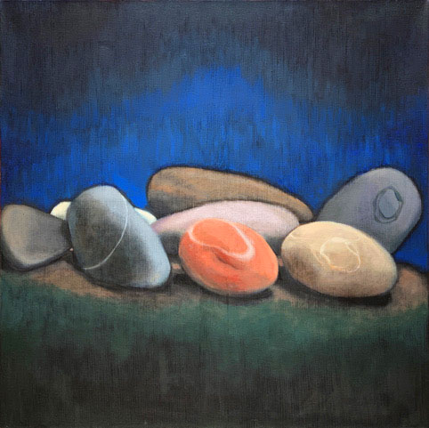 The small rocks, were also collected in Abiquiu. When I brought them to my studio to paint, it was not their solid weight that struck me most, but their shimmering immateriality. They seemed not to have firm edges as I expected. Enlarging them suggested outer space to me, the loneliness of planets. I chose to carry the blue skies, the visible ether, which are a given in the landscapes, into the other images, for continuity, and it gives presence to all of the subjects in these paintings.